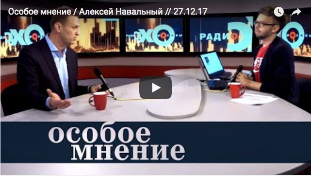 Poliitikko Aleksei Navalnyi (vas.) toimittajan Aleksei Solominin haastateltavana radioasema Eho Moskvyn studiossa 27.12.2017.