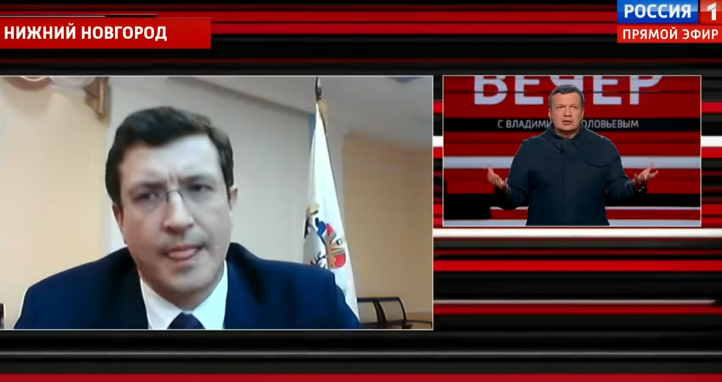 Samaan malliin toimii muukin propaganda. Normaalistikin äänekkään Vladimir Solovjevin puheleminen Nižni Novgorodin kuvernöörin Gleb Nikitinin kanssa näytti tarkkaan harkitulta.