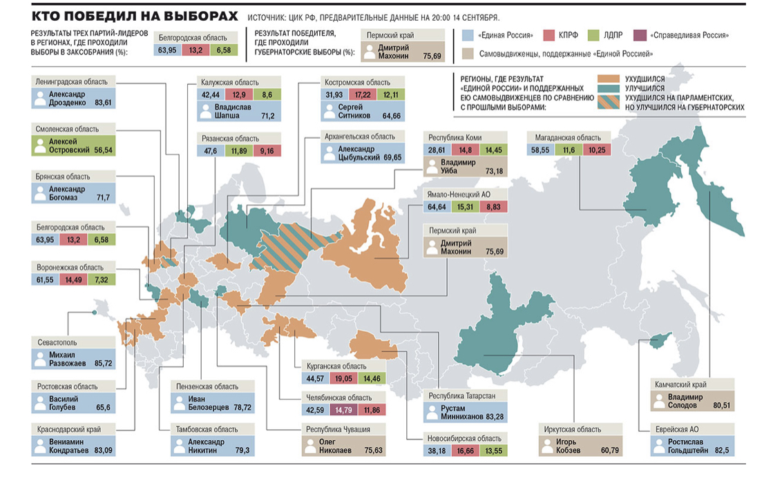 Yleisesti voidaan todeta, että valtapuolue Yhtenäinen Venäjä sai aluevaaleissa noin  10 prosenttia vähemmän ääniä kuin vuoden 2019 vaaleissa.”