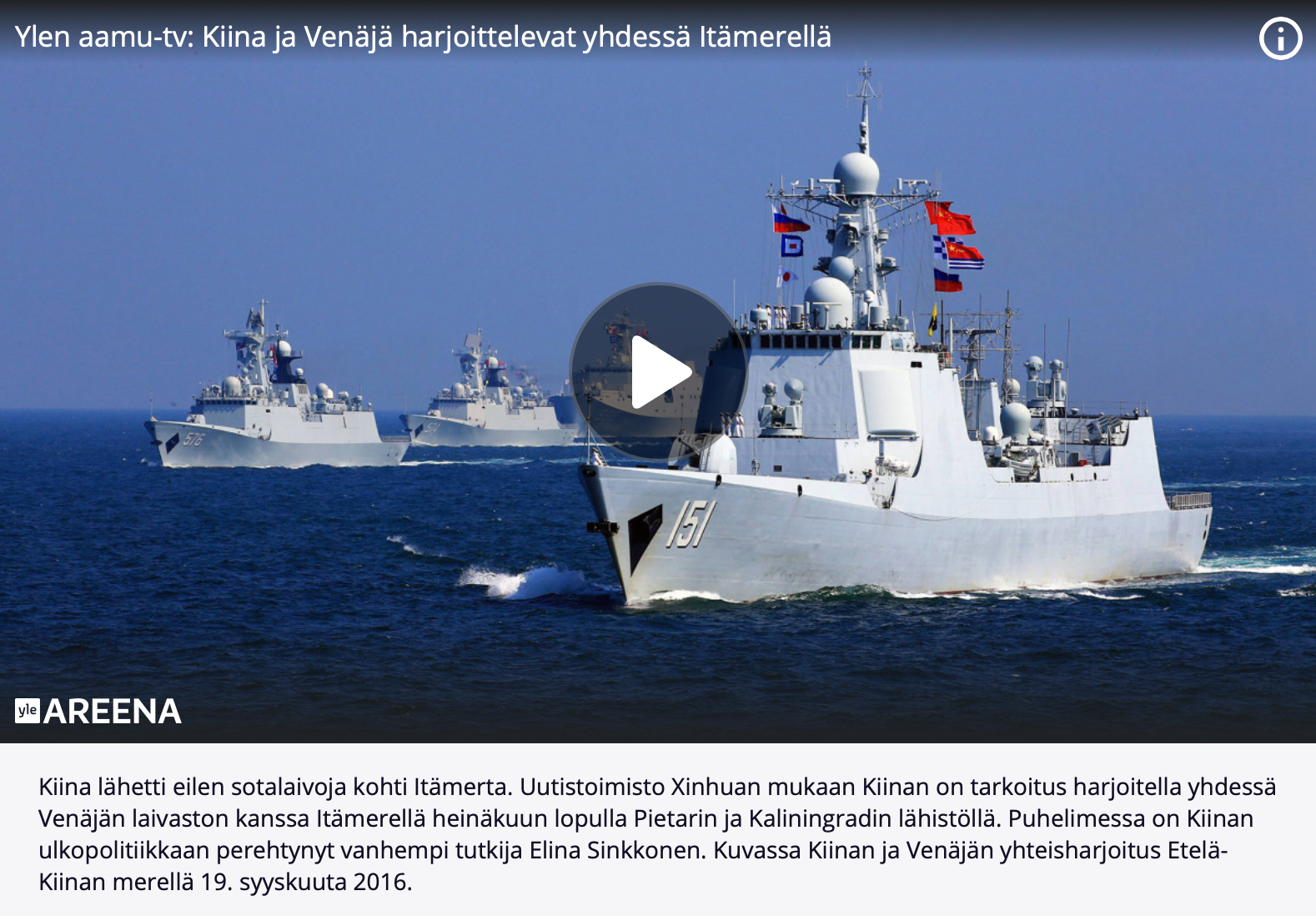 Haukkalan mielestä Kiinan aggressiiviseksi koettu politiikka vaikkapa Etelä-Kiinan merellä voidaan nähdä ainakin osin puolustuksellisessa valossa. (Linkki kuvassa esiteltyyn Ylen juttuun.)