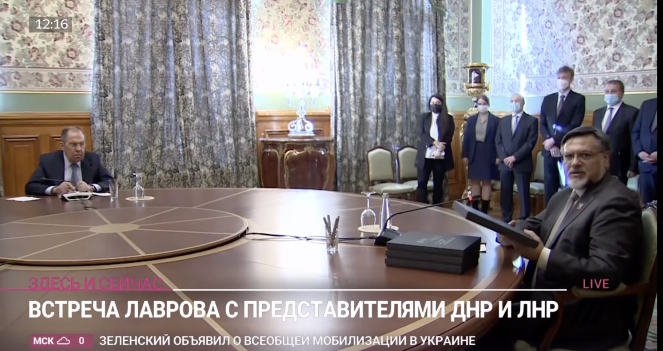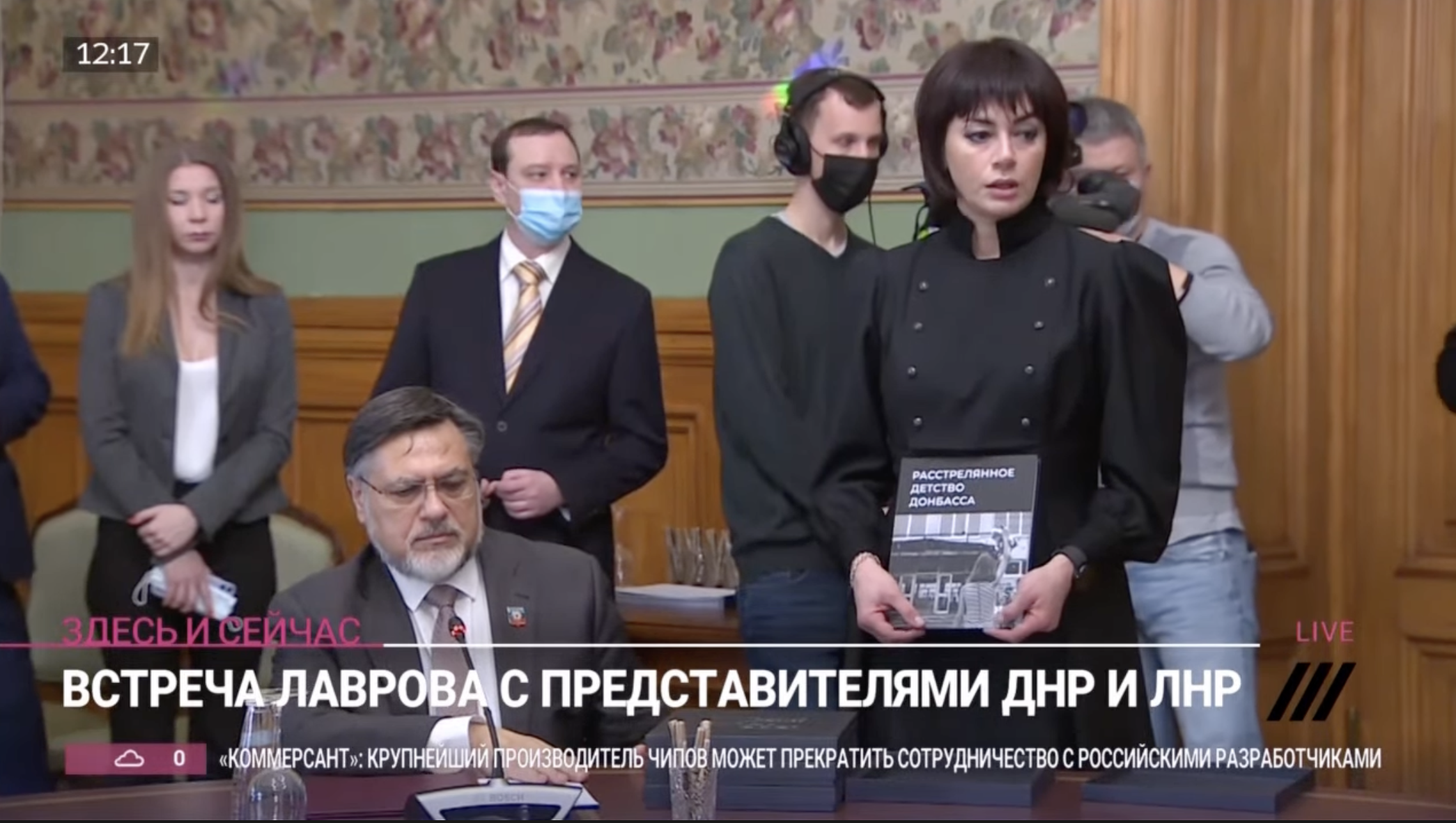 Venäjän tukemien feikkivaltioiden niin sanotut johtajat nyökyttelevät, kun Lavroville esitellään kirjaa kansanmurhan oloissa kasvaneista lapsista Itä-Ukrainassa.
