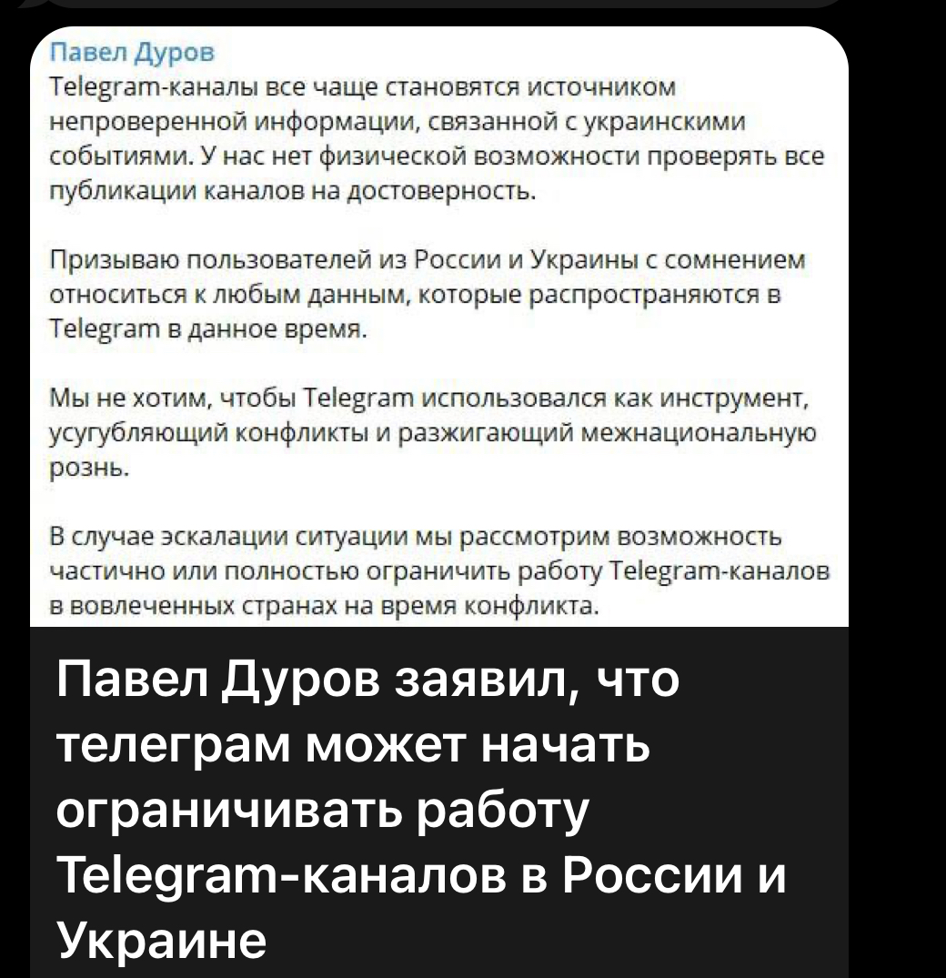 Myös Telegram-palvelun omistaja Pavel Durov on joutunut ottamaan kantaa siihen, millaista kirjoittelua alustalle ei voida jatkossa hyväksyä Ukraina ”tapahtumiin” liittyen. Durov ilmoitti, ettei Telegram halua olla välikappale kansallisuuksien väkisessä kiistelyssä.