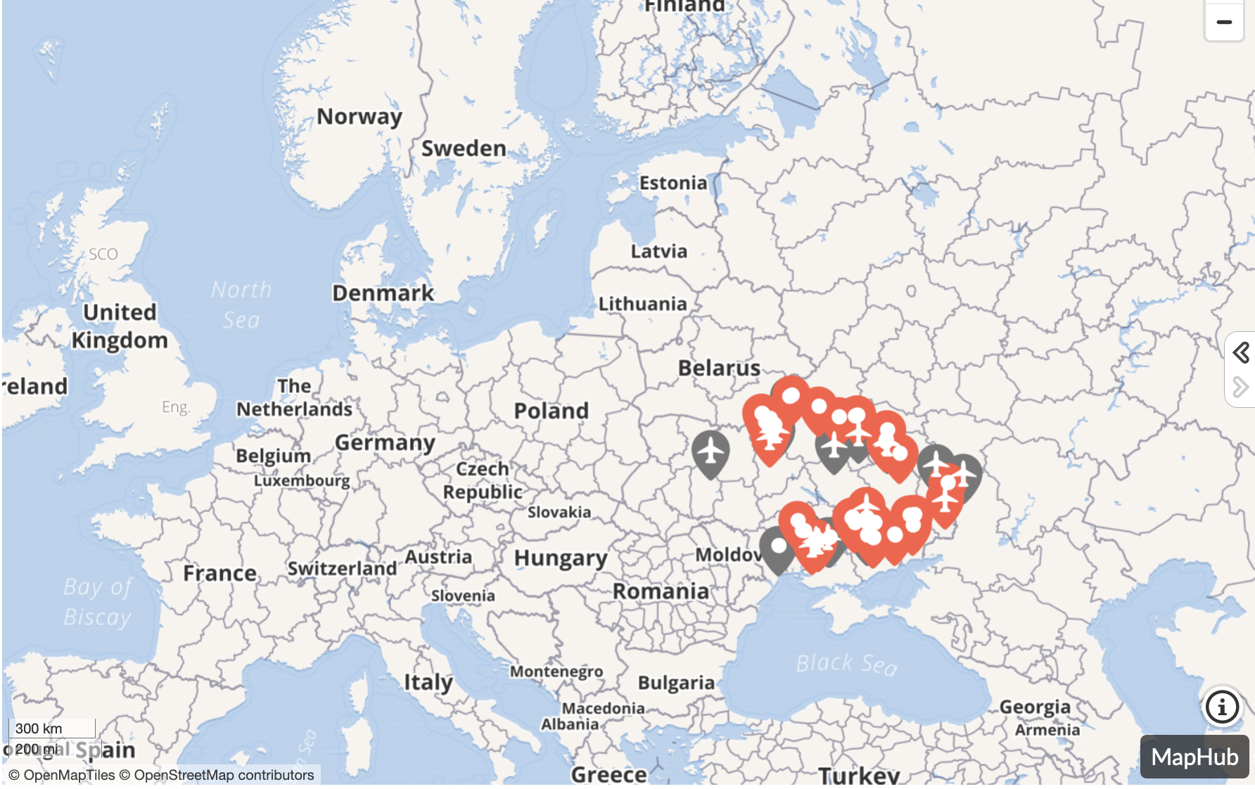 Karttaan on merkitty paikkoja, joissa on ollut sotilaallista toimintaa
