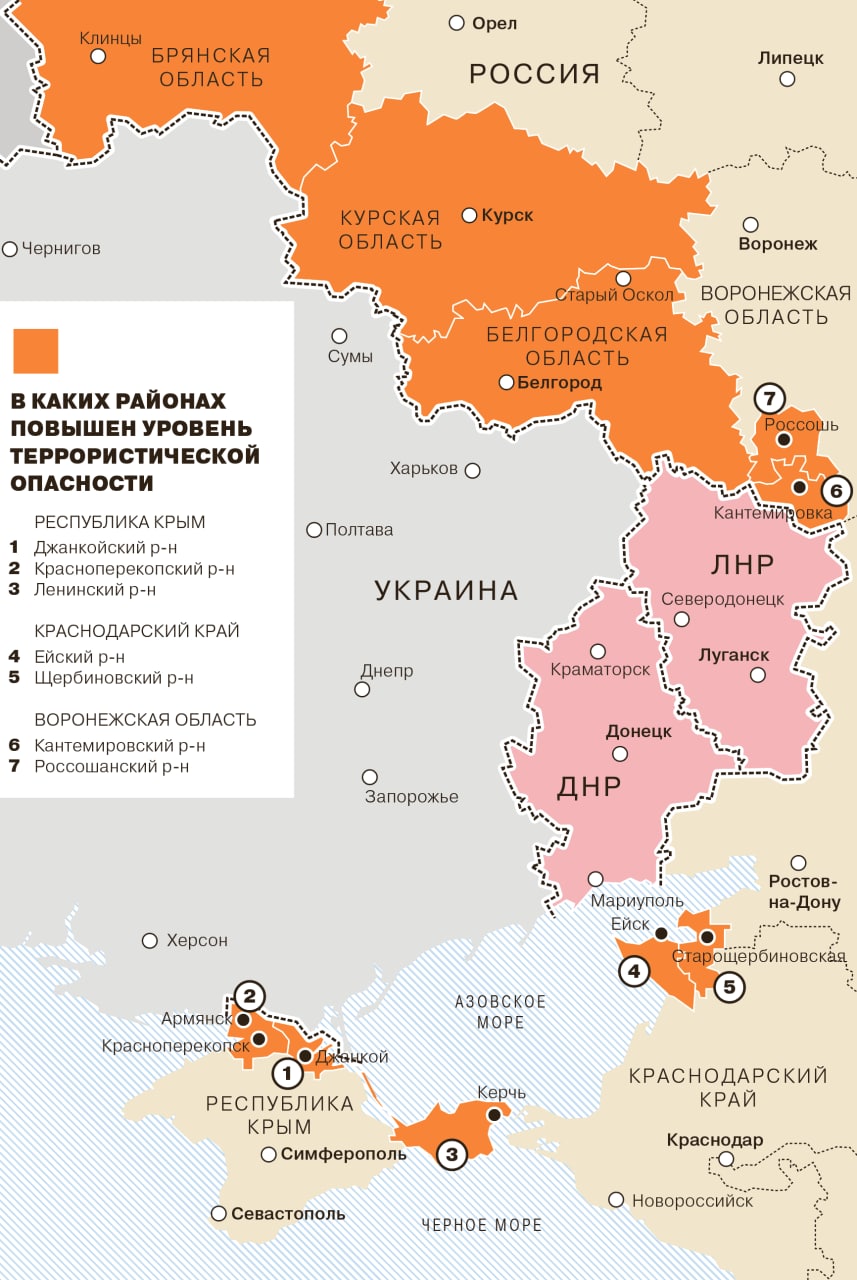 Telegramissa julkaistussa kartassa esitetään, että Ukrainan terroristien vuoksi Venäjän puolella on nostettu valmiutta. Oranssit alueet ovat Venäjällä (paitsi Krimillä); vaaleanpunaiset Venäjän Ukrainalta kaappaamia maakuntia.
