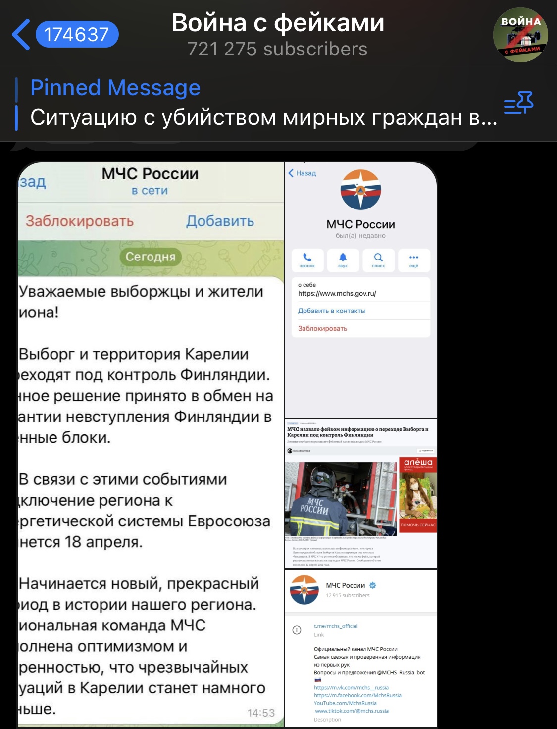 Valeuutisista kertova venäläinen Telegram-kanava puolestaan esittelee sivullaan maan sisäministeriön virallisia sivustoja muistuttavaa postausta, jossa väitetään Viipurin ja Karjalan siirtyneen Suomen hallintaan. Valeuutisia tarkkaileva Voina s Feikami-sivusto kehottaa ilmoittamaan viranomaisille tällaisestä harhaanjohtamisesta.
